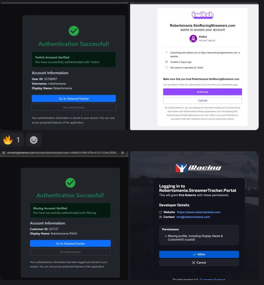 Users can authenticate against both iRacing and Twitch and perform self-service registration.