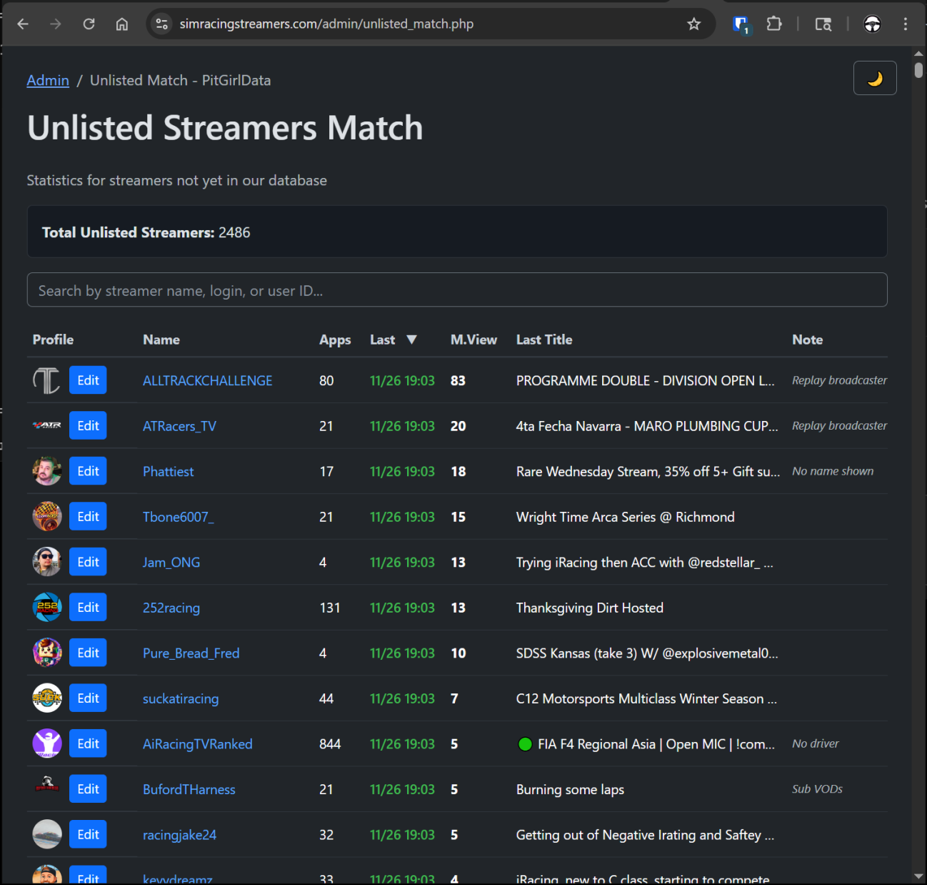 Getting iRacing driver to Twitch streamer associations and building admin tools to help the process along.