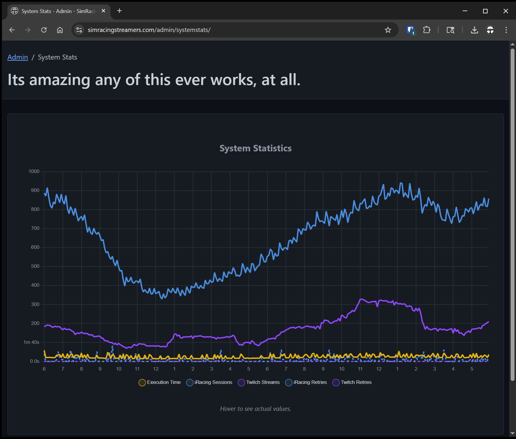 Kutu had a neat Stats page on WhoWas that showed the iRacing, Twitched and matched streamers values over time. I wanted to borrow from that for our site.