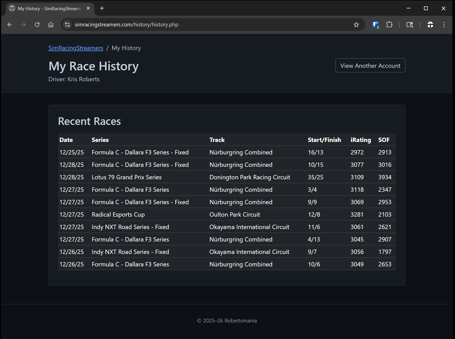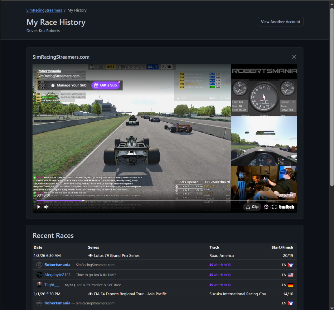 Every registered Twitch account has a direct URL at www.simracingstreamers.com/StreamerName which brings up their Recent Events page.